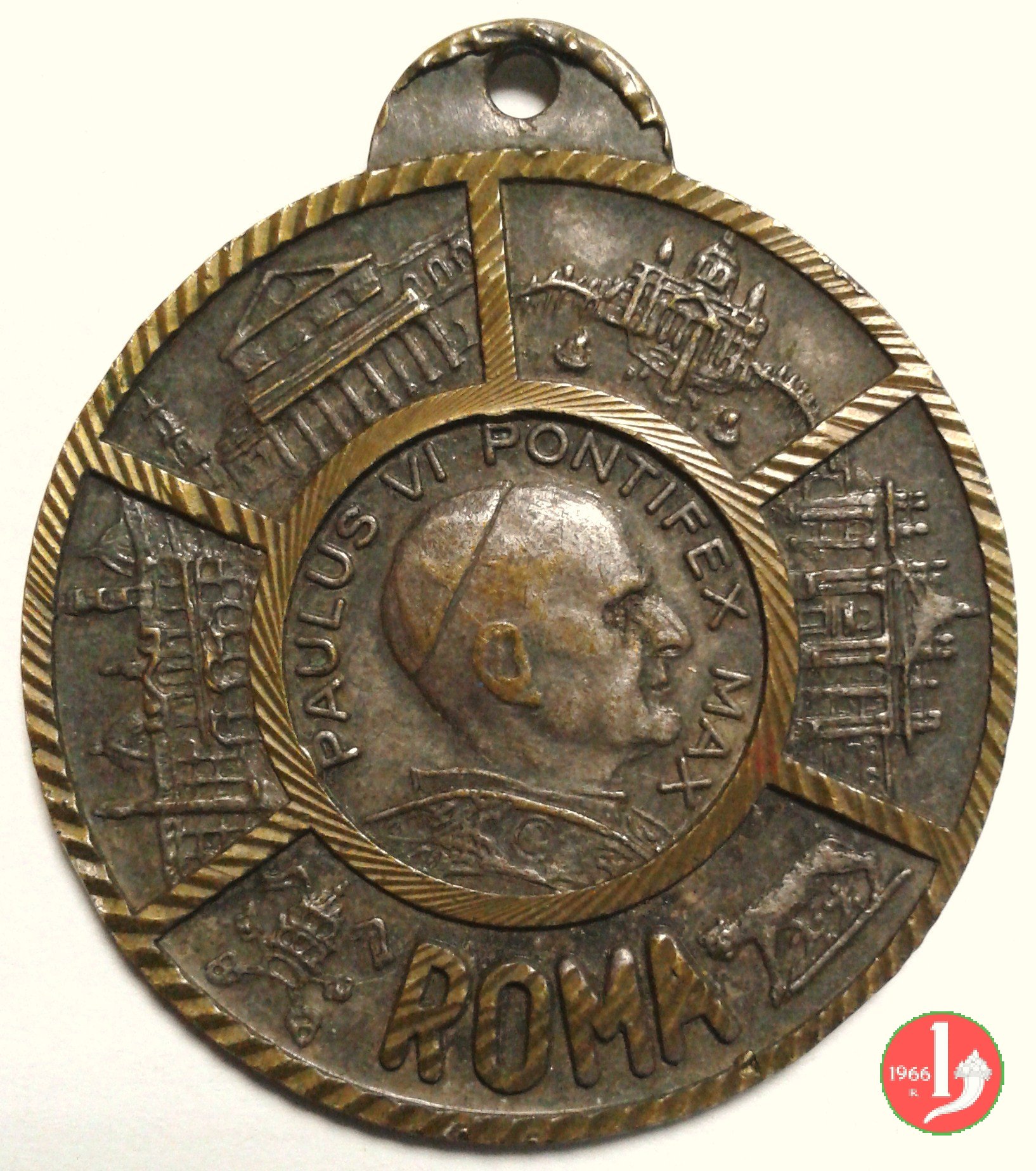 Basiliche e San Cristoforo Dritto: entro medaglia centrale in cornice divisa in cinque settori: PAULUS VI PONTIFEX MAX nei settori: vista delle quattro Basiliche Patriarcali e sotto ROMA tra triregno e lupa |