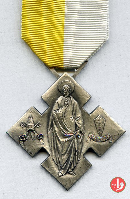 Benemerenti -MM690 Obverse: San Pietro nimbato e benedicente di fronte tra chiavi decussate sormontate da triregno e Stemma Papale su motto in nastro Sotto al triregno su chiavi decussate: E. MANFRINI |