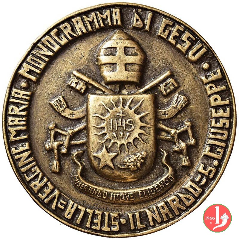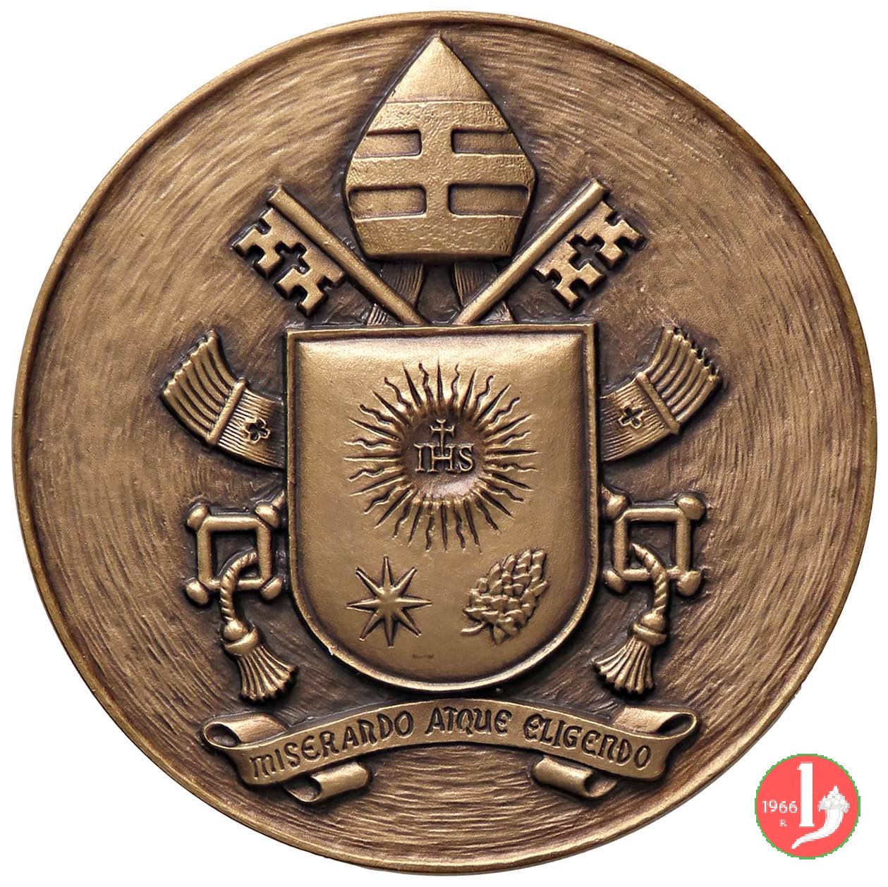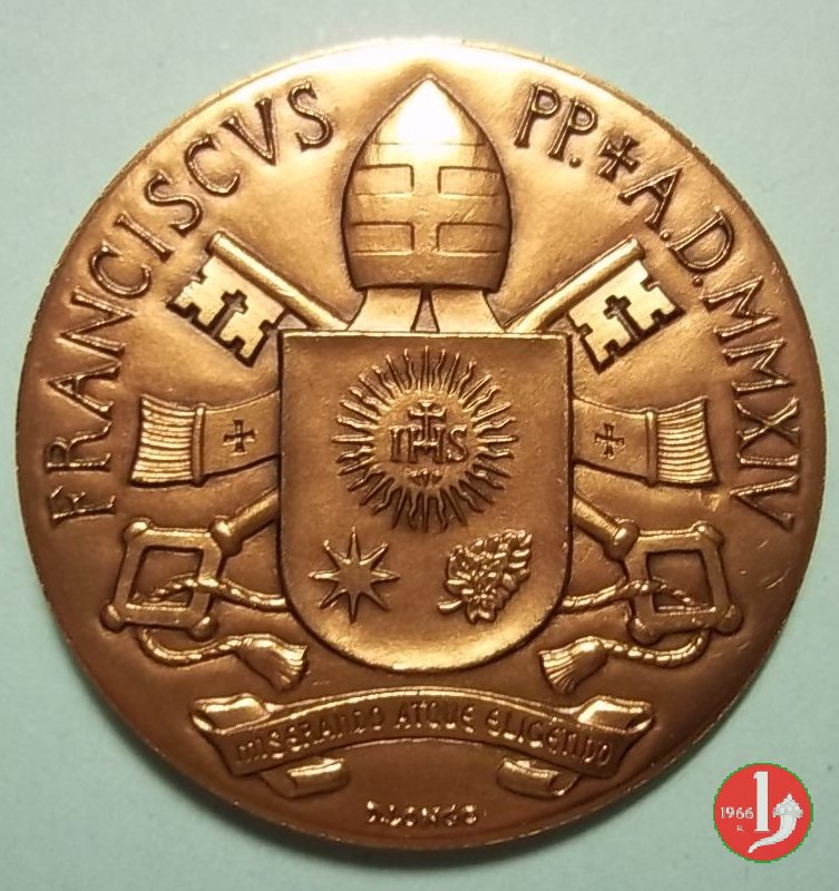 Verso: Stemma Papale sormontato da mitra tripartita su chiavi decussate e sotto motto in nastro: MISERANDO ATQUE ELIGENDO