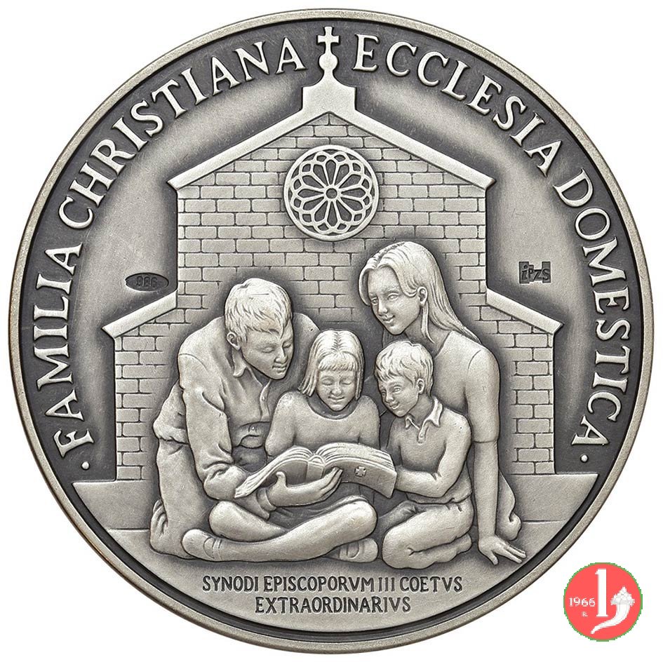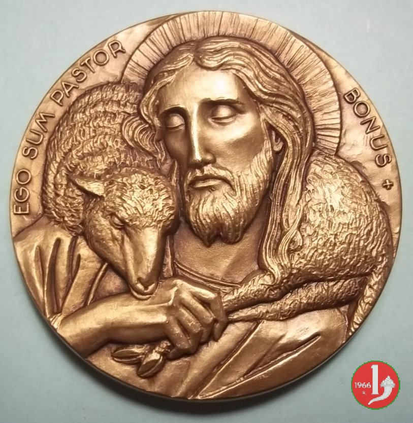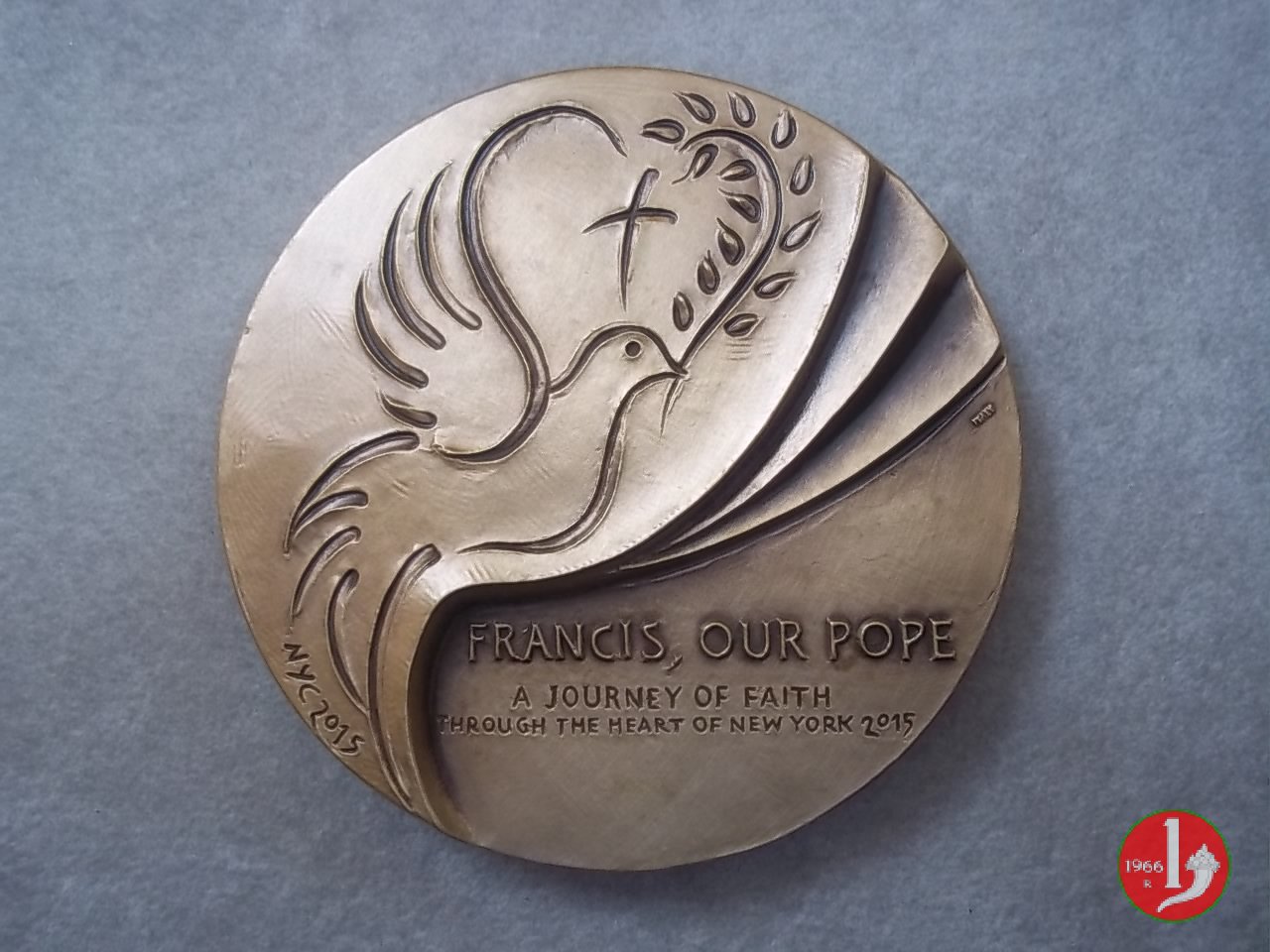 Dritto: La colomba dello Spirito Santo nimbata, attraversa la porta santa irraggiata da fascio di luce, sulla soglia martello-picco e cazzuola tra mattoni