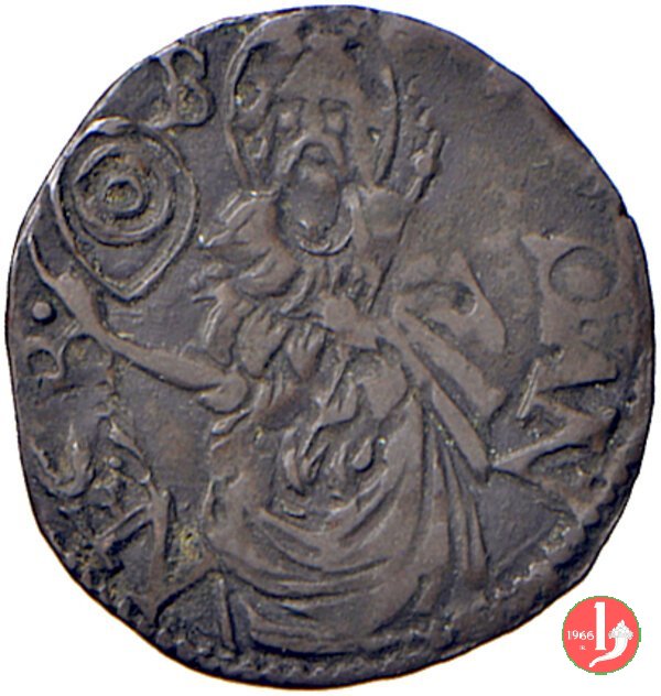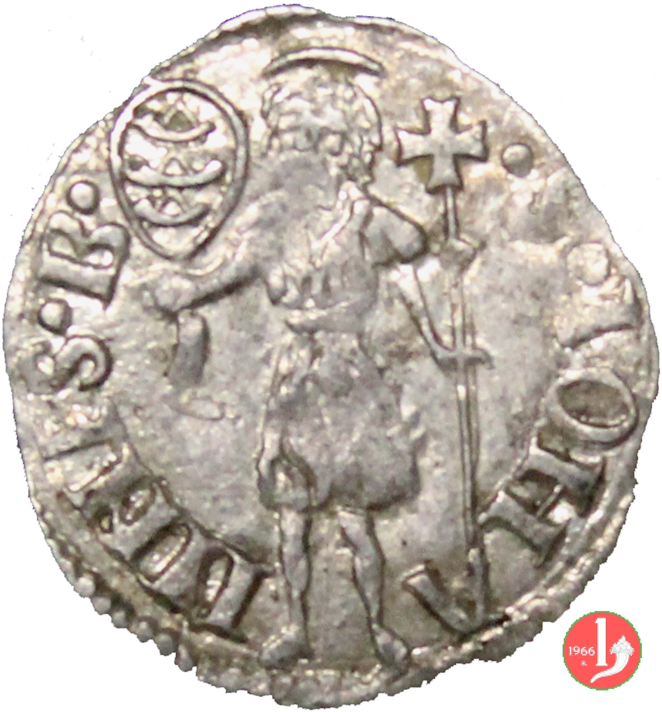 Il Santo è rappresentato in piedi, con nimbo perlato, indossa una tunica di panno ed un mantello di pelo, liscio in basso, allacciato al petto con bottone pieno al centro come il globetto dell'asta della croce. La figura del Santo è piú sottile ed i caratteri della legenda sono piú piccoli. Benedice con la mano destra, con le dita della mano piú divaricate, e regge con la sinistra una lunga asta con una croce alla sua sommità, appoggiata sulla spalla; S. c.