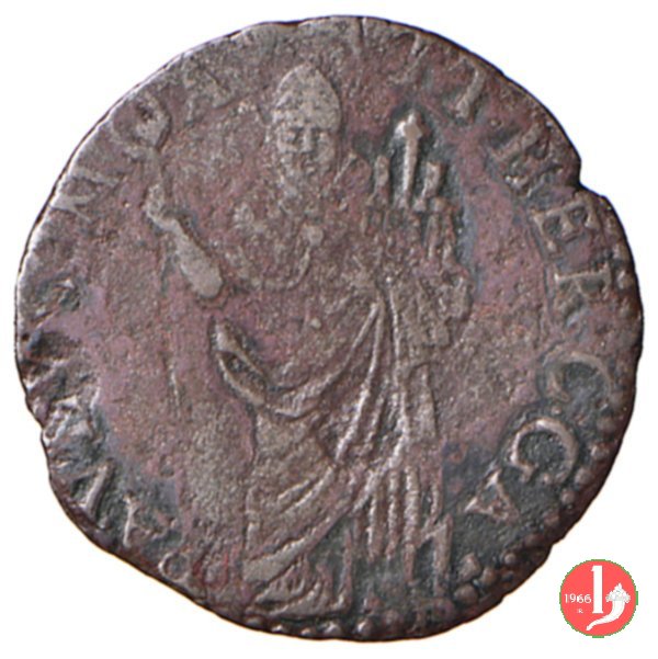 Muraiola (tipo Bologna) Dritto: PAV • MAT • HER FRA Santo nimbato e mitrato, con pastorale nella mano destra e città nella sinistra. Busto di Pontefice a destra. | |