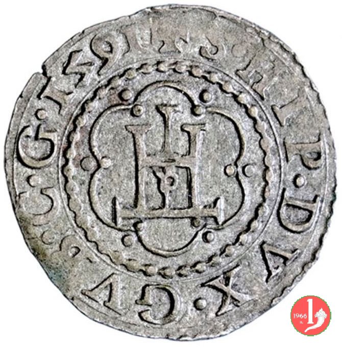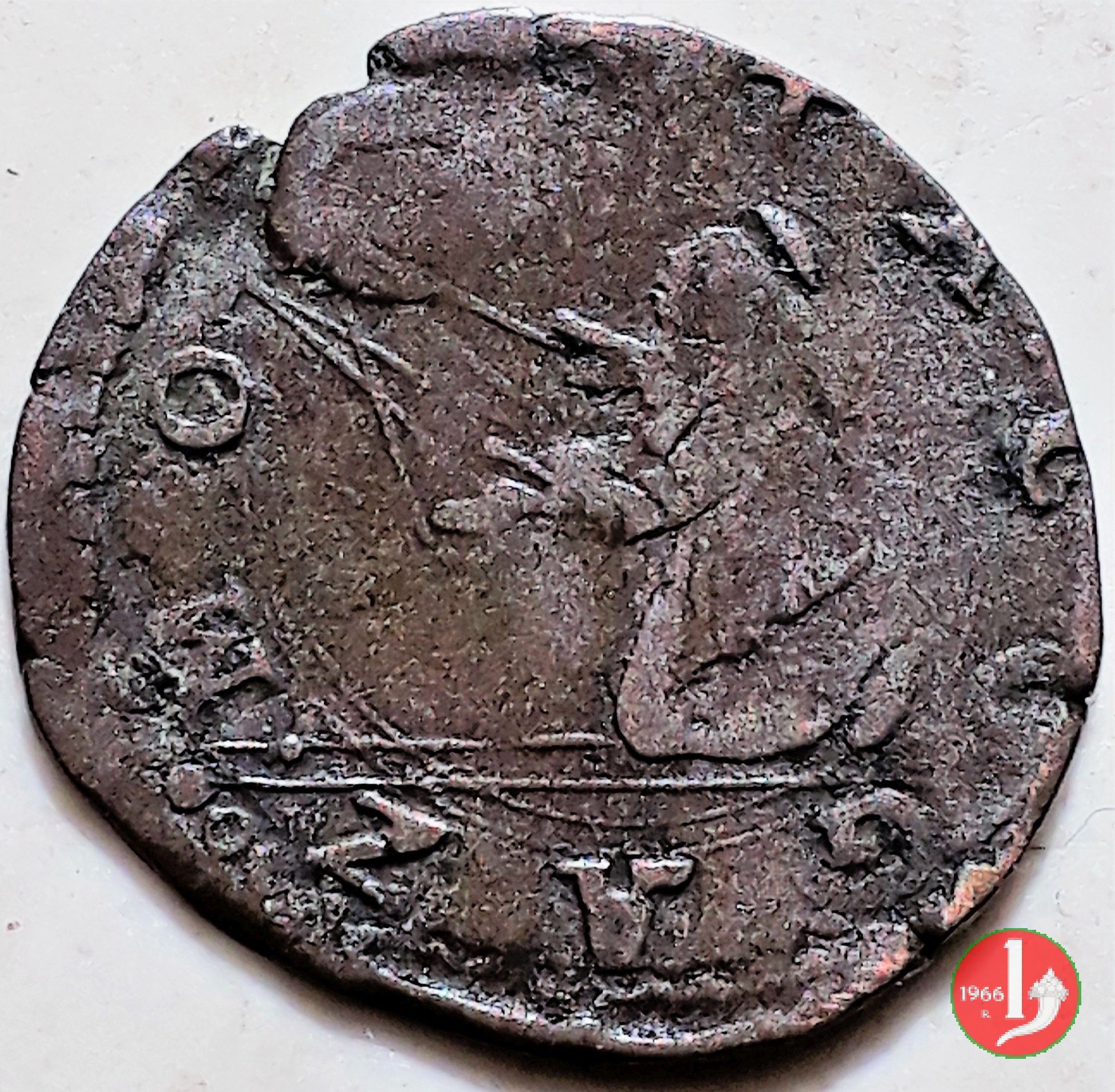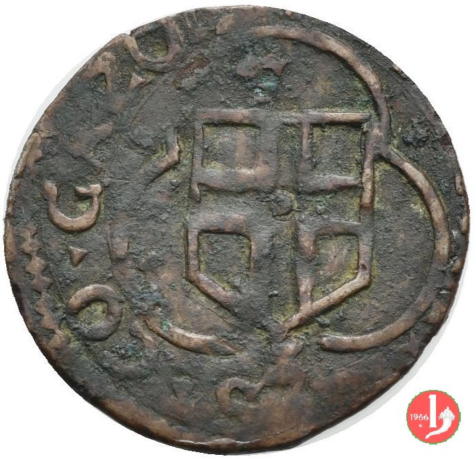 Soldino (tipo Genova) Dritto: ✠ S • HIP • DVX • GVB • C • G • (data) Castello tipo Genova, entro cornice di sei archetti, con globetti a punte e angoli. Croce patente entro cornice di sei archetti, con globetti a punte e angoli. | |