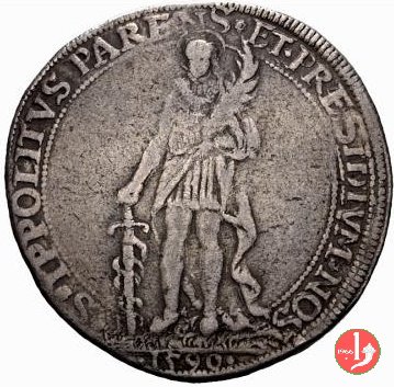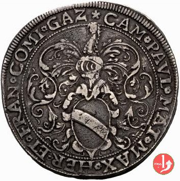 Ducatone Dritto: CAM ![]() PAVL ![]() MAT ![]() MAX ![]() HER ![]() ET ![]() FRAN ![]() COMI ![]() GAZ ![]() ![]() Stemma sormontato da cimiero circondato da festoni. Sant'Ippolito stante, con ramo di palma nella mano sinistra e spada nella mano destra; in es., data. | |