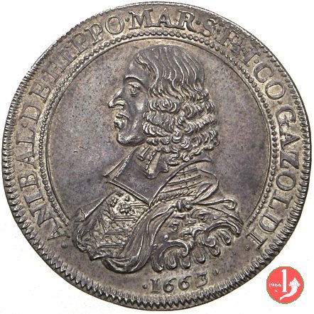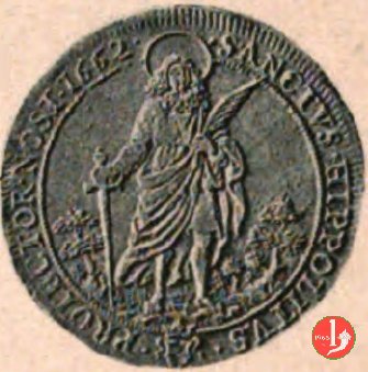 Da 2 doppie Dritto: • ANNIBAL Busto paludato a sinistra, con lunga capigliatura. Sant'Ippolito con palma nella mano sinistra e spada nella destra appoggiata a terra, sullo sfondo, alberetti; nel giro in b., scudo con banda coronato. |