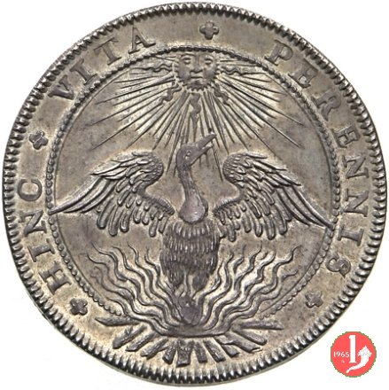 Mezzo tallero Dritto: • ANIBAL Busto paludato a sinistra, con lunga capigliatura; sotto, • data •. Fenice sul rogo, guarda verso il sole. | |