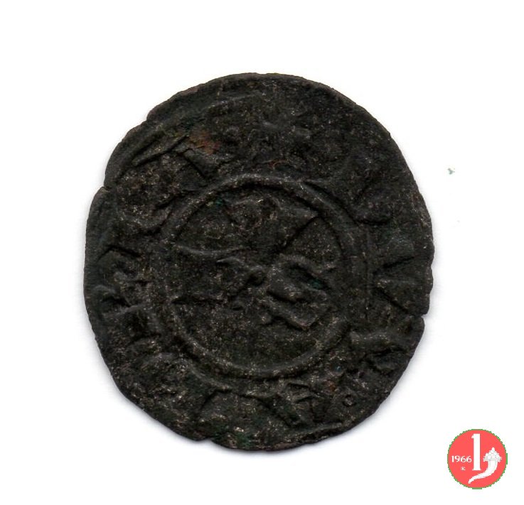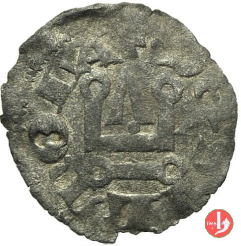 denaro tornese Dritto: + R °ALFONSUS °; croce patente. Verso: + °DE° SULMONA ; castello tornese. | |