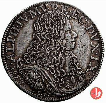 Ducatone Dritto: ALPH • IV • MV • RE • E • C • DVX • IX • Busto del Duca a destra, corazzato e con lunga capigliatura. In esergo • 1659 • • E • T • Spada sgnainata in palo con corona d'alloro. | |
