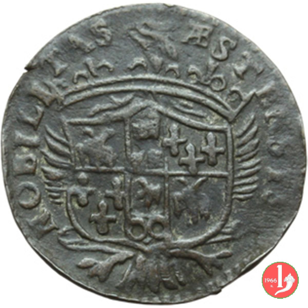 Sesino con aquila estense Dritto: FRA • II • MVT • REG • E • C • DVX • X • Busto del Duca rivolto a sinistra, corazzato e con lunga capigliatura. Aquila estense sopra capitello, coronata e spiegata, con la testa rivolta a sinistra. | |