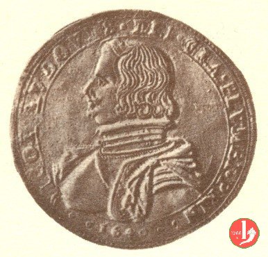 testone s.d. 2° tipo Dritto: PRINCEPS PLVMBINI Busto a destra corazzato con lunga capigliatura Verso: D • IOAN • BAPTA LVDOVISIO • D • G Stemma a forma di cetra in cartella coronata,ornata di ricci e fogliame e circondata dal collare del Toson d'oro |