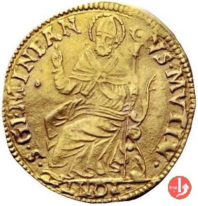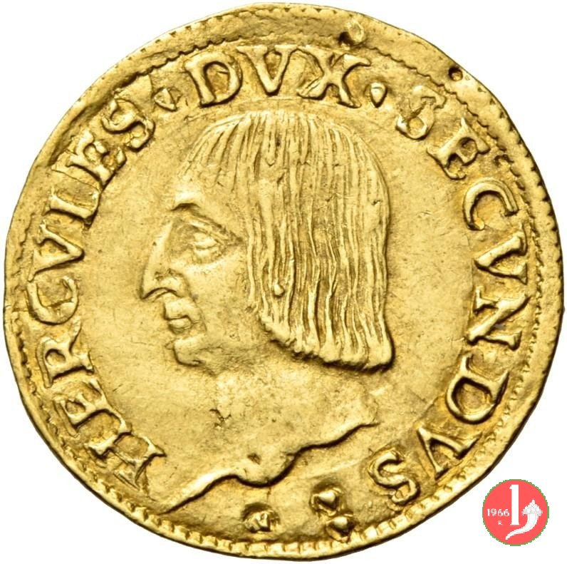 ducato con testa nuda Dritto: • HERCVLES • DVX • SECVNDVS • Testa nuda del duca, rivolto a sinistra Il Santo nimbato, mitrato e con paludamento, seduto in cattedra di fronte, benedice con la destra e tiene il pastorale nella sinistra | |
