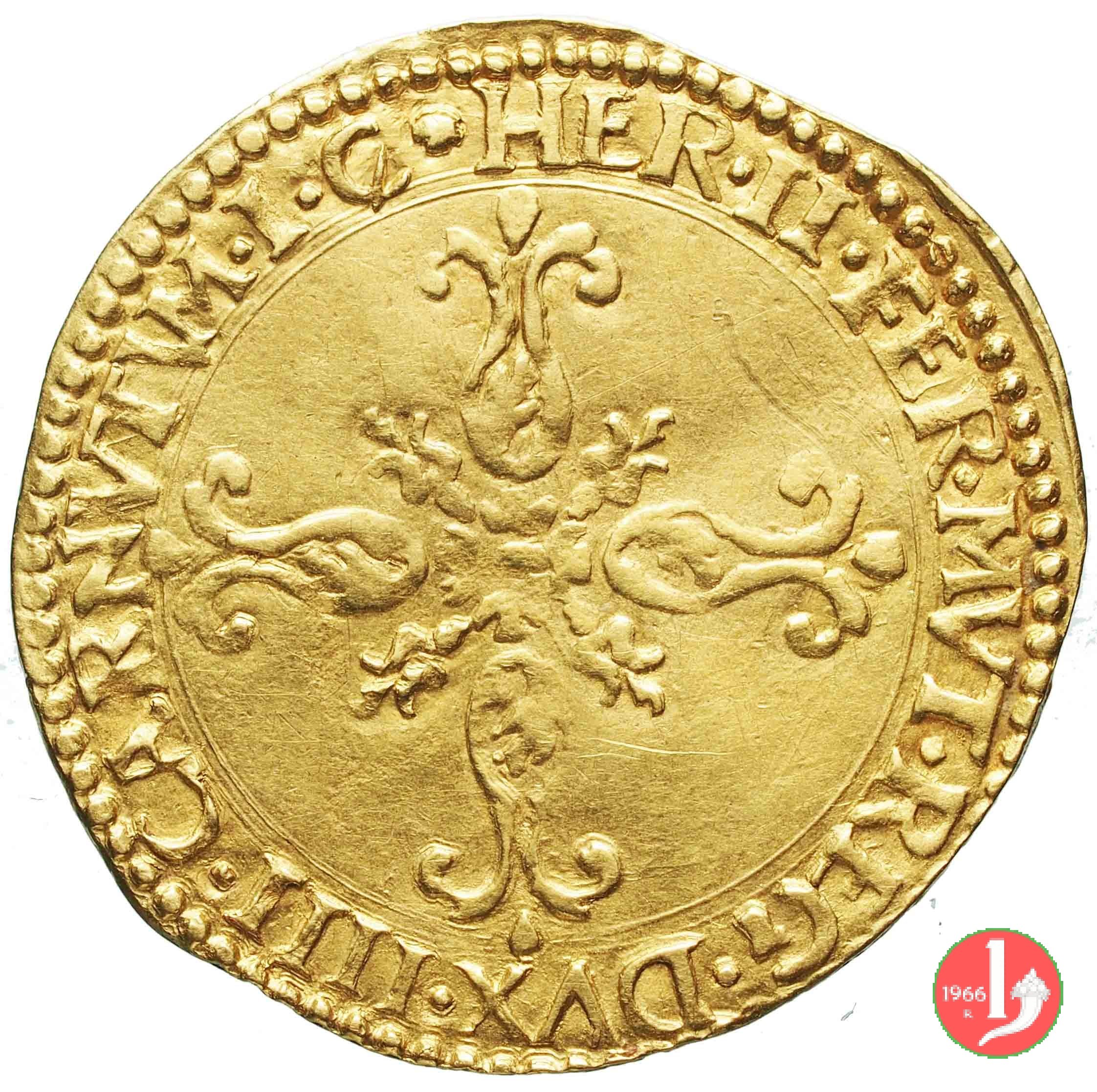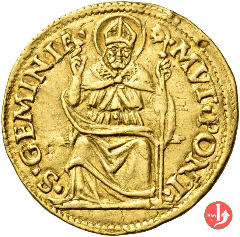 Scudo d'oro del sole Dritto: HERCVLES • II • DVX • MVTINAE ![]() IIII ![]() ![]() Croce gigliata e ornata, accantonata da 4 gigli. Il Santo nimbato e mitrato, seduto e rivolto a sinistra, benedice con la destra e tiene la sinistra distesa sul ginocchio col pastorale appoggiato alla spalla sinistra. | |