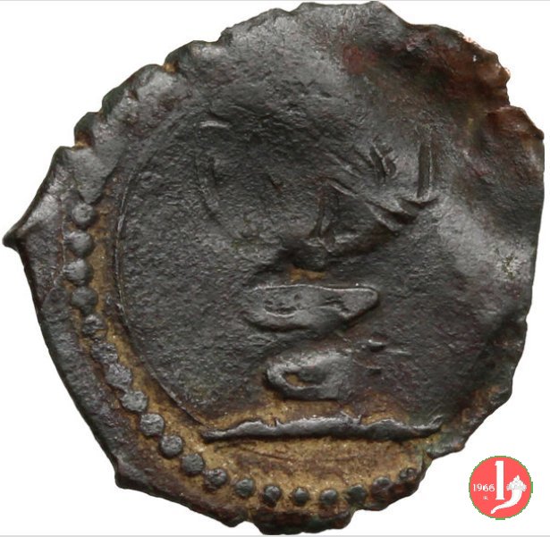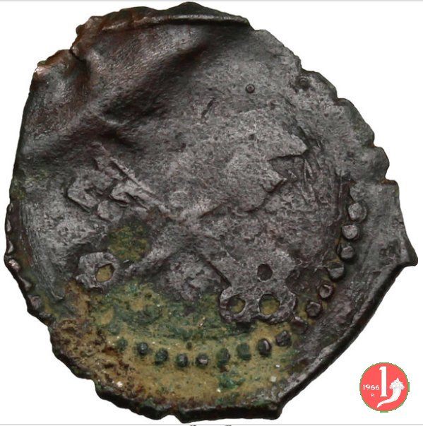 Mezzo denaro (?) con chiavi decussate e sfera armillare Dritto: Anepigrafe Chiavi decussate con impugnature trilobate. Sfera armillare. | |