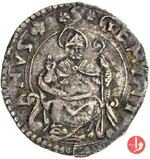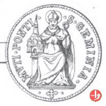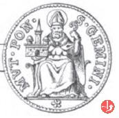 Quattrino con stemma Dritto: MVTINENSIS Stemma comunale in scudo ornato superiormente con un fiore. Verso: • S • GEM INIANVS • Il Santo nimbato e mitrato, seduto di fronte, benedice con la destra e tiene il pastorale nella sinistra. | |
