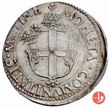 Mezzo tallero del leone Dritto: MO • NO • DA • SESIN • XXXV • DE • DVX MI • Guerriero elmato e corazzato a mezza figura, sopra scudo a cartocci entro il quale è leone rampante a sinistra. Leone rampante a sinistra. | |