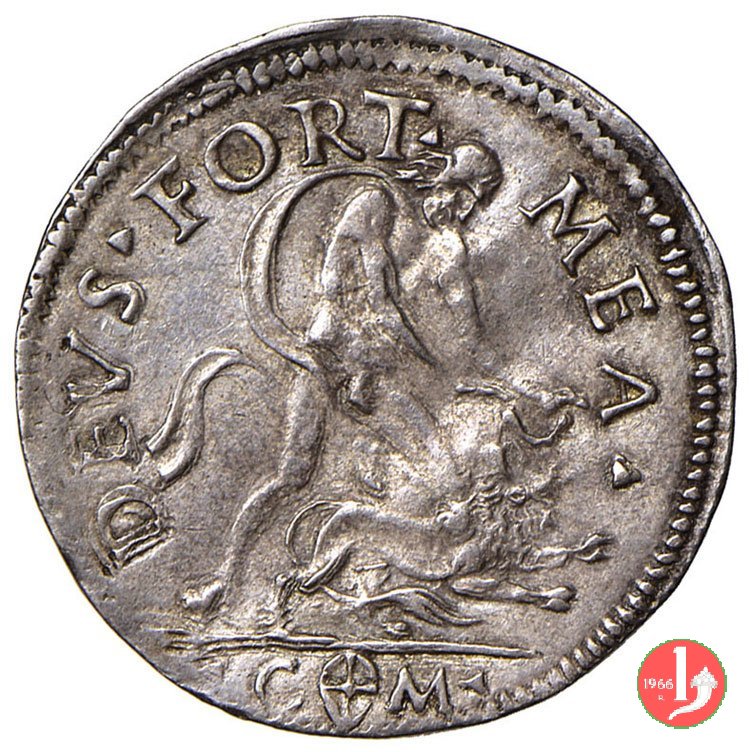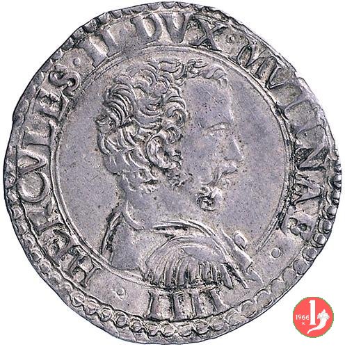 mezzo testone con ritratto Dritto: • HERCVLES • DVX • INVICTISS • testa nuda rivolta a sinistra Ercole nell'atto di abbattere un leone. In esergo • C • stemma della città M • | |