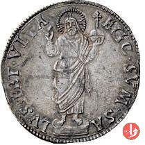 Zecchino con ritratto Dritto: (foglia) CLEMENS • VII • PONT • MAX • Busto del Papa con piviale ornato di cameo rappresentante le teste degli apostoli Pietro e Paolo. Il Santo seduto e benedicente con la mano destra e pastorale nella sinistra. In esergo le armi della città e del Cardinale Salviati. | |