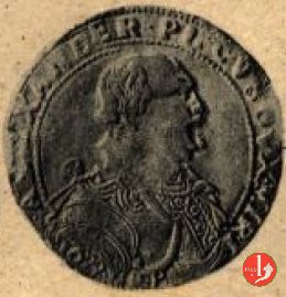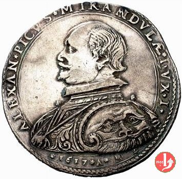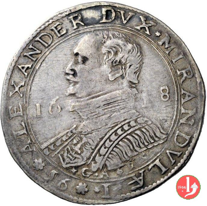 Lira con busto a s. Dritto: • ALEXANDER • PICVS • DVX • MIR • II Busto corazzato a sinistra, con lunga capigliatura. Scudo inquartato sormontato da aquila bicipite ad ali spiegate, caricato da scudetto Pico scaccato, entro cartella ornata a volute e sormontata da corona. | |