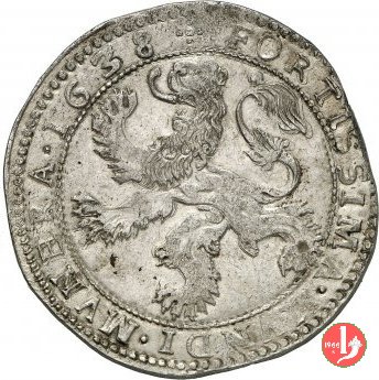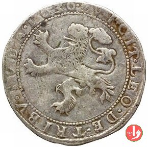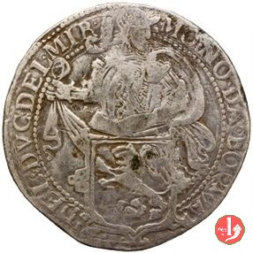 Tallero del leone Dritto: MO • NOV • DEL • DVC • DEL • MIR • DA • BO • QVAR • Guerriero elmato e corazzato a mezza figura, sopra scudo a cartocci entro il quale è leone rampante a sinistra. Leone rampante a sinistra. | |