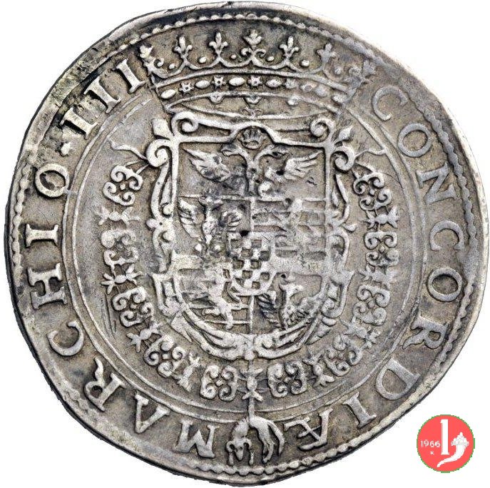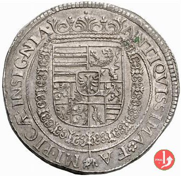 Tallero con busto a d. e stemma Dritto: ALEX • DVX • MIR • I • CON • MAR • III • S • MART • IN • SPI • DOM Busto corazzato a destra, con gorgiera e Toson d'Oro. Scudo inquartato, caricato da scudetto con aquila spiegata, sormontato da corona e circondato da collare del Toson d'Oro. | |