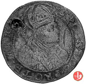 Giulio con ritratto barbuto Dritto: ALFONSVS • DVX • FERRARIAE • III • Testa nuda e barbuta rivolta a sinistra. Il santo nimbato e mitrato, seduto di fronte, benedice con la destra e tiene il pastorale con la sinistra. | |