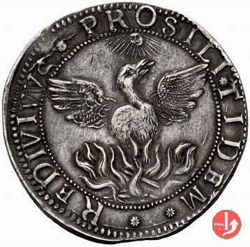 Mezzo ducatone Dritto: ALEXAN • PICVS • DVX • MIRA • II • Busto corazzato a destra, con lunga capigliatura. Fenice ad ali spiegate tra le fiamme, volta verso sole che sorge sopra di lei. | |