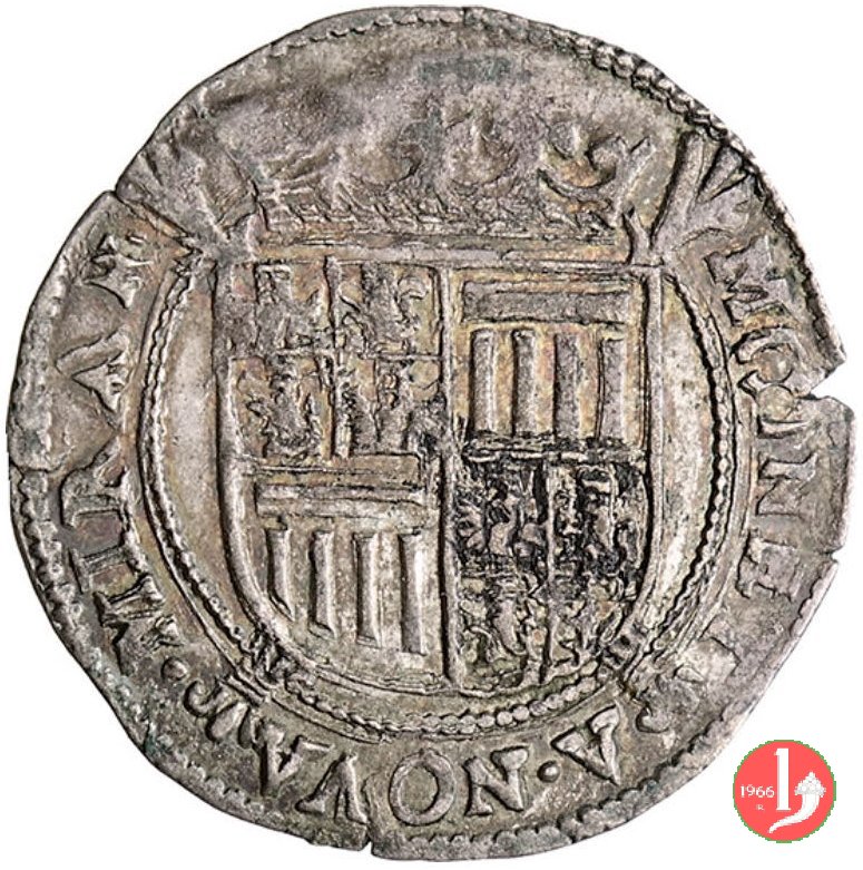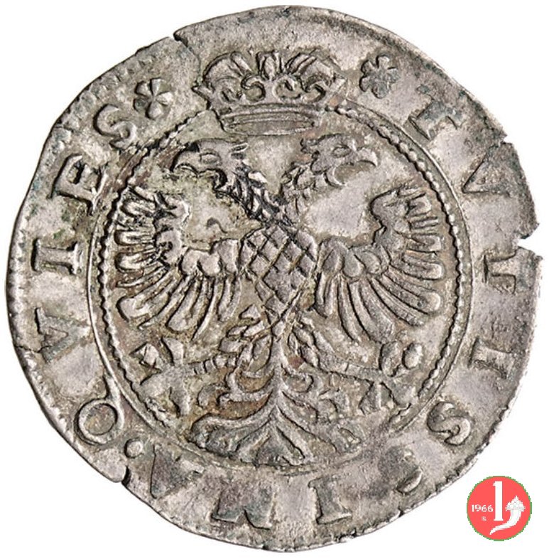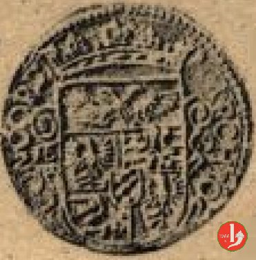 Testone con stemma e aquila bicipite Dritto: MONETA • NOVA • ARGENTEA Stemma coronato circondato dal Toson d'Oro. Aquila bicipite coronata, ad ali spiegate, con una croce tra le teste e il numerale 24 sul petto. | |