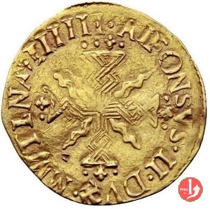 Scudo d'oro del sole Dritto: ALFONSVS ![]() DVX ![]() FERRARIAE ![]() III Croce ornata e gigliata, accantonata da 4 gigli con gambo. Il Santo nimbato e mitrato, seduto e rivolto a sinistra, benedice con la destra e tiene la sinistra distesa sul ginocchio col pastorale appoggiato sulla spalla sinistra. | |