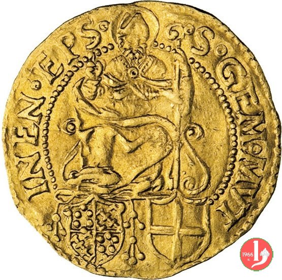 Ducato d'oro Dritto: MAXIMIL • RO • IMP • M • D • Il busto dell'imperatore rivolto a destra. La figura del santo seduto in abiti pontificali, con la mano destra sorregge la città, con la mano destra tiene il pastorale. In esergo rosetta. | |