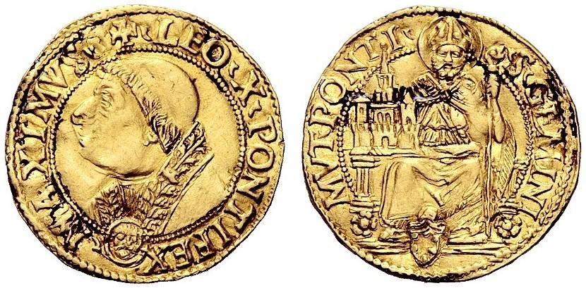 Zecchino o Ducato d'oro Dritto: + ![]() LEO ![]() X ![]() PONTIF EX ![]() MAXIMVS ![]() ![]() Il busto del pontefice rivolto a sinistra. La figura del santo seduto in abiti pontificali, con la mano destra sorregge la città, con la mano sinistra tiene il pastorale. In esergo stemma dei Medici sormontato da tiara pontificia. | |