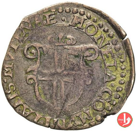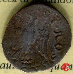 bagattino 1° tipo Dritto: RESPVBLICA (triangolo) MVTINAE (triangolo) stemma della città a forma di testa di cavallo nel campo busto del santo frontale nimbato e mitrato | |