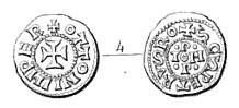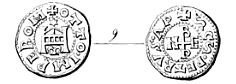 Dritto: Croce potenziata che attraversa tutto il campo, accantonata da lineette; in giro MARINO C[]