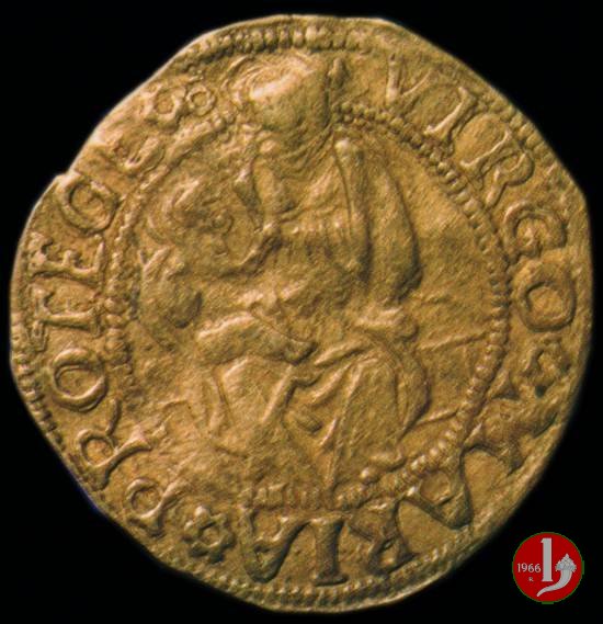 nel campo Vergine seduta con il Bambino velata in cerchio rigato con sotto scudo Fregoso che interrompe la legenda