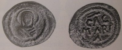 Verso: Monogramma formato di croce ansata e lettere E B N V (Ecclesie Basiliane Venantius).