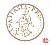 Il Vescovo, mitrato, in piedi di fronte, benedicente con la dx e tiene il pastorale con la sx in c. rigato.