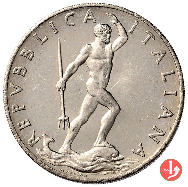 Obverse: Timone. Intorno, lungo il bordo REPVBBLICA • ITALIANA. In Basso, sempre lungo il bordo, indicazione dell'autore (G • ROMAGNOLI).