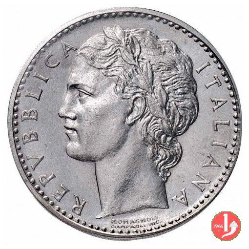 Obverse: Testa di donna con corona di foglie di quercia volta a destra, intorno REPVBBLICA • ITALIANA. Sotto lungo il bordo un rombo e l'indicazione degli autori (ROMAGNOLI • GIAMPAOLI INC •) su tre righe.