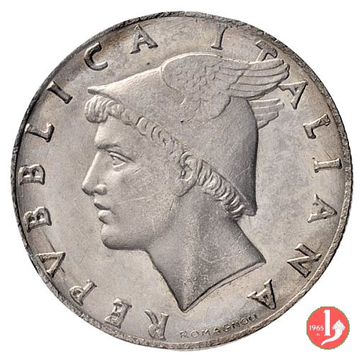 Obverse: Testa di donna volta a sinistra con il capo cinto da una corona di alloro. Intorno REPVBBLICA ITALIANA. Sotto l'indicazione degli autori (ROMAGNOLI GIAMPAOLI INC •) su due righe.