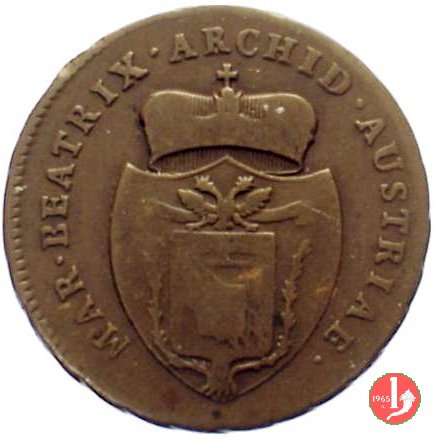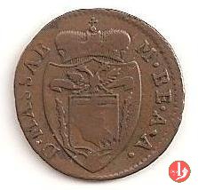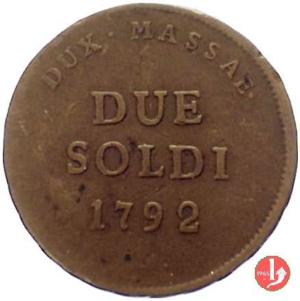 2 soldi Obverse: Stemma dei Cybo con scudetto fasciato d'Austria fra due rami di spino e sormontato da aquila bicipite austriaca. In alto corona ducale. Intorno MAR • BEATRIX • ARCHID • AUSTRIAE •. Reverse: Indicazione del valore e millesimo su tre righe (DUE\ SOLDI\ 1792). Intorno, nella parte superiore, DUX • MASSAE •. | |