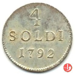 4 soldi Obverse: Stemma dei Cybo con scudetto fasciato d'Austria fra due rami di spino e sormontato da aquila bicipite austriaca. In alto corona ducale. Intorno M • BE • A • A • D • MASSAE •. Reverse: Indicazione del valore e millesimo su tre righe (4\ SOLDI\ 1792). | |