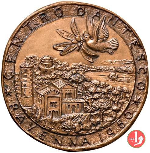 Omaggio alla Città di Dante 1980 Dritto: OMAGGIO _ DI MANZU' ALLA CITTà DI DANTE * busto di Giacomo Manzú a sx, tocca foglia d'alloro in basso, a dx: BERTI = 1980 vista aerea di composizione di monumenti di Ravenna sorvolati da colomba che reca in becco ramo d'ulivo | |