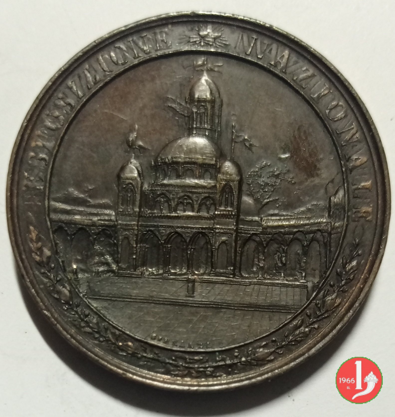 Esposizione Nazionale 1891-92 Dritto: ESPOSIZIONE * NAZIONALE vista della sede Espositiva nel campo, a sx, presso il bordo interno: NATOLI in esergo: 1891-92 sotto: fregio d'alloro Vista, di 3/4 a dx, del monumento ai "fratelli Kanaris" sulla base: CORONA REGIS = ET REGNI CAPUT | |