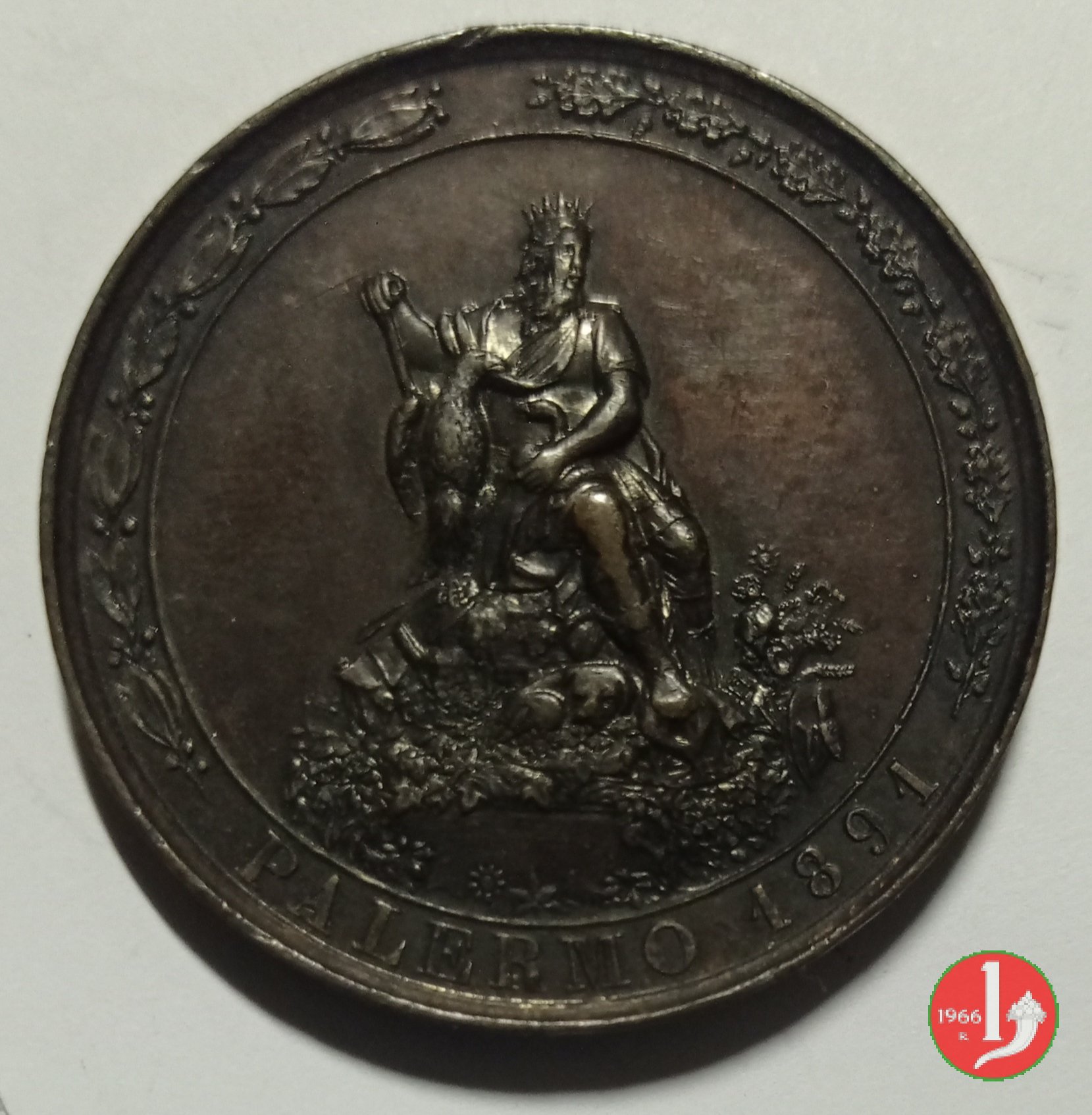 Esposizione Nazionale in Palermo 1891 Dritto: ESPOSIZIONE NAZIONALE entro cornice circolare continua sormontata da stella raggiante e ornata da rami d'alloro in basso: vista del palazzo delle esposizioni in basso circolarmente sopra alla cornice: SPERANZA entro cornice circolare continua sormontata da rami d'alloro e quercia: genio di Palermo coronato e paludato seduto su cumulo di pietre ornato da fiori e vegetazione, rivolto verso dx, con serpente e bastone, presso aquila | |