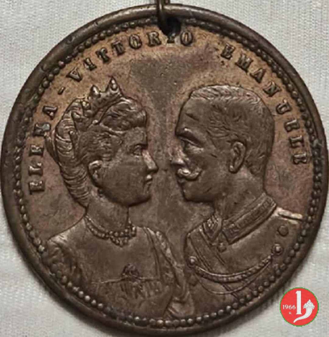 Nozze con Elena del Montenegro 1896 Obverse: S • A • ELENA • DI • MONTENEGRO • S • A • R • VITTOR • E • DI • SAVOIA Busti accollati a sx della principessa Elena del Montenegro con doppia collana di perle e abito di pizzo e di Vittorio Emanuele con divisa militare e collare della SS. Annunziata in basso: G. TUA TORINO | |