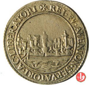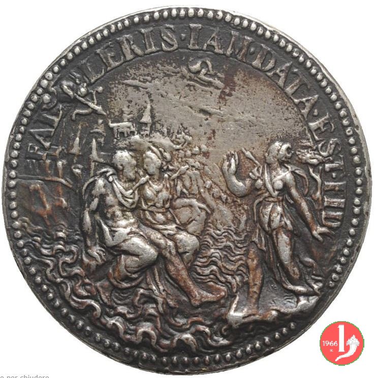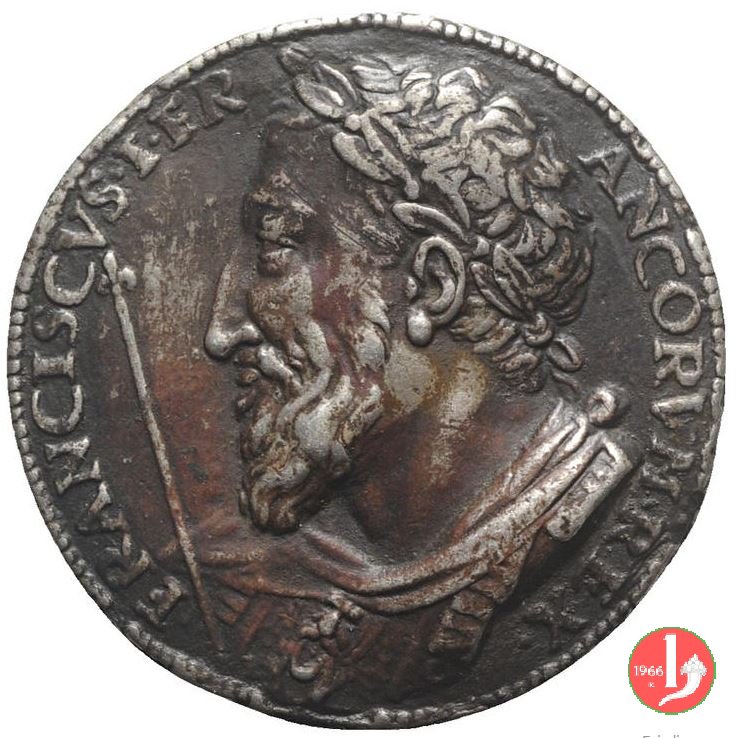 Francesco I - Falleris iam data Dritto: FRANCISCVS • I • FR _ ANCORVM • REX Busto laureato a sx con mantello e corazza Francesco I seduto verso dx con una donna, sopra uno scoglio che sorge da un mare burrascoso; sulla dx, donna stante colle braccia distese sembra rivolgere loro una parola; In alto a sx, Cupido scaglia dardo; sullo sfondo: veduta di una città | |