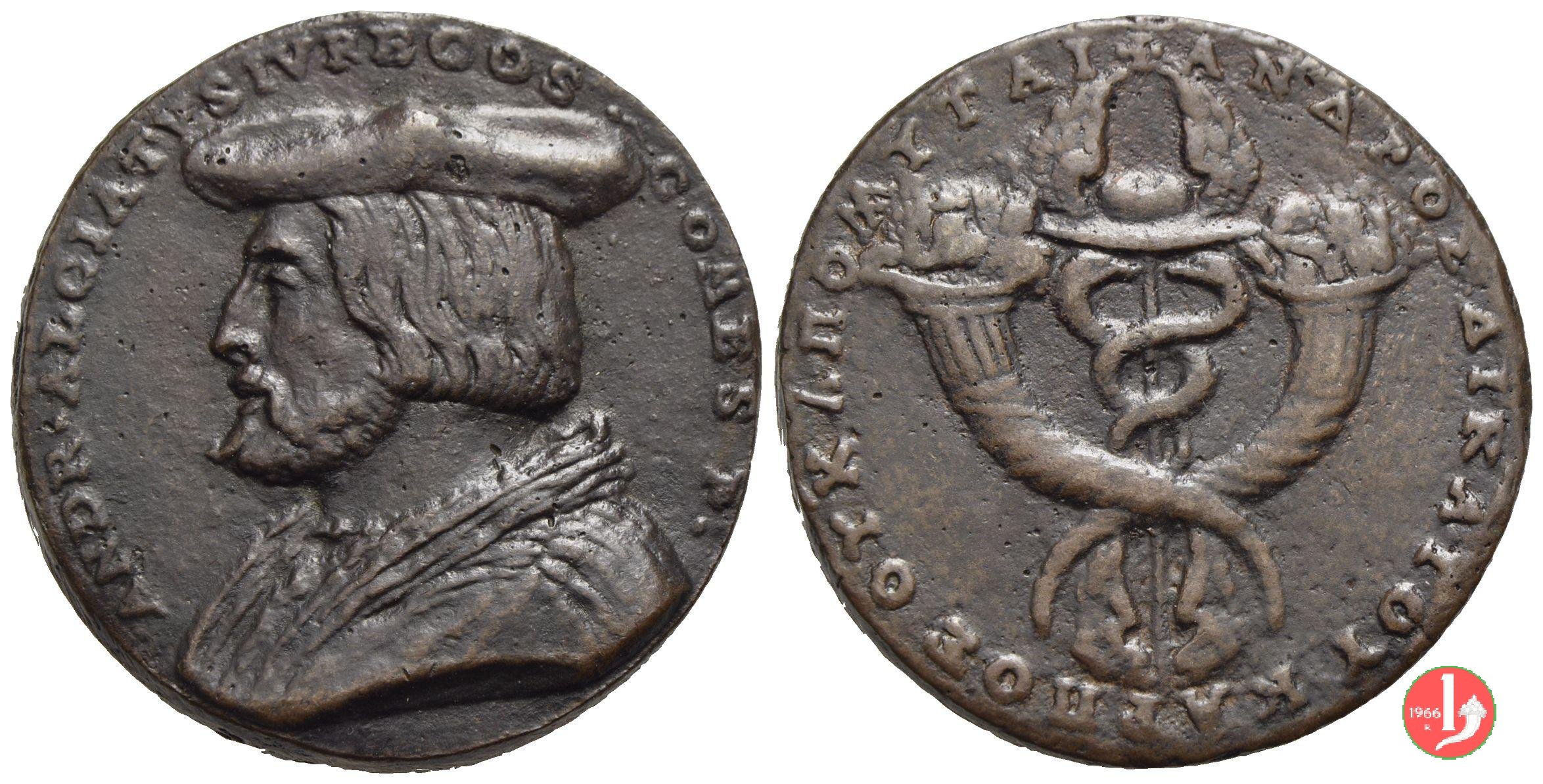 Andrea Alciato Dritto: ANDR • ALCIATES IVRECONS • COMES P • busto a sx con barba e cappello caduceo tra cornucopie decussate | |