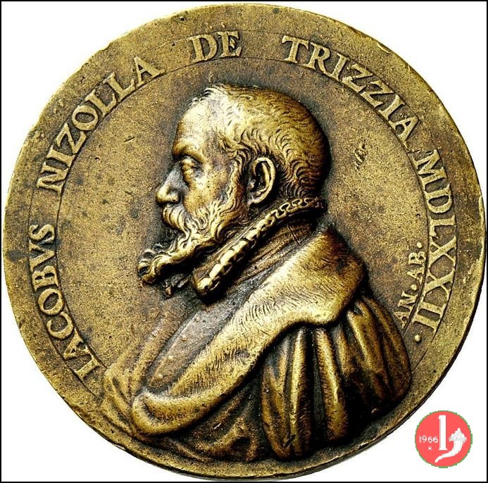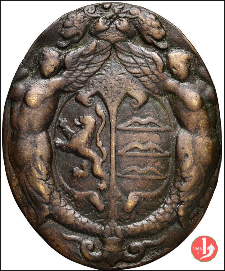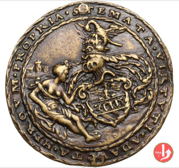 Baldassarre Ravoyra della Croce 1559 Dritto: BALTHAS • A’ RAVOYRA • • DNS • CRVCIS • AET • AN• XXIIII busto a sx con giubba dal collo alla spagnola nel campo a dx: PPR figura femminile seduta su tronco di fronte e volta a dx, mira uccello, in alto tra nubi, con ramo nel becco, a dx albero | |