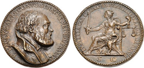 Arrigoni Paolo Pietro Dritto: P PAVLVS ARRIGONVS SENATVS MEDIOL PRAESES busto a dx con camicia e giubba La figura allegorica della Giustizia seduta verso sx, regge bilancia e spada in esergo: S C | |