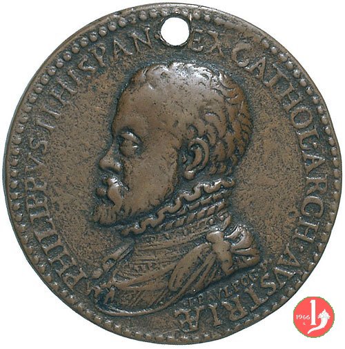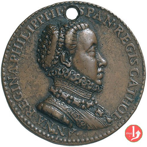 Filippo II e Anna d'Austria Dritto: PHILIPPVS • II • HISPAN • REX • CATHOL • ARCH • AVSTRIAE busto corazzato a sx, con collare spagnolo sotto: I • PAVL • POGG • F • busto a dx con cuffia perlinata, collana con pendente e abito ricamato con colletto alla spagnola | |