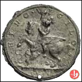 Barbara Borromeo -M122 Dritto: BARBARA GONZ • BORR • COM • NOVELL • ANN • XVII busto a dx con capelli raccolti e doppia collana di perle Pegaso, in volo verso dx, presso la Fonte di Castalia, alla sommità di cime nel paesaggio Pindo, Elicora e Parnaso con braceri incendiano l'intorno | |